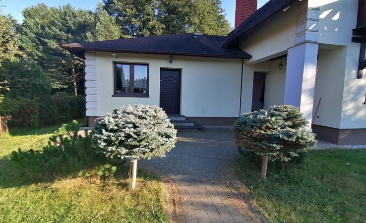 Na zewnątrz zadbany trawnik, wędzarnia, oświetlenie zewnętrzne oraz punkty zasilania prądu i wody. Chodniki wokół i wjazd na posesję wybrukowane kostką. Dom podłączony jest do kanalizacji miejskiej, a odpływ wody z rynien i drenaży skierowany jest do trzykomorowego zbiornika gdzie zamontowana jest pompa do podlewania działki.