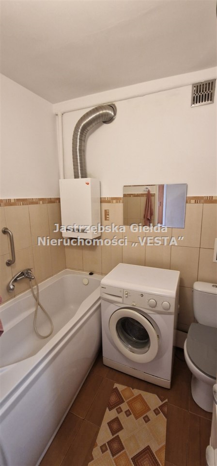 Łazienka w kafelkach na wyposażeniu wanna, pralka,szafka łazienkowa, lustro, nowy junkers i czujnik czadu.