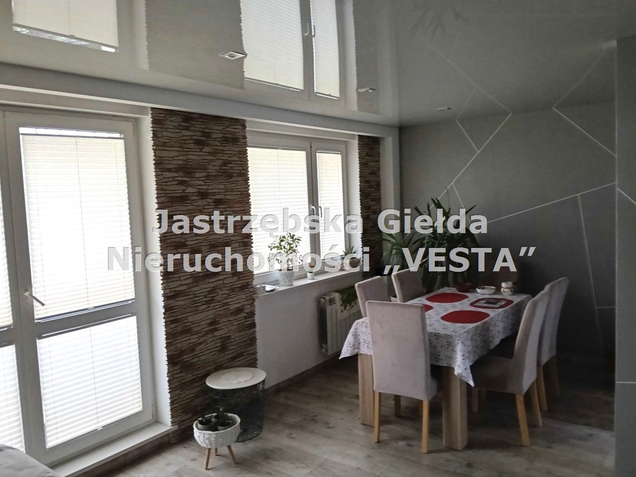 Na ścianach gładzie , kamień ozdobny w salonie sufit napinany, na podłogach panele i kafle.