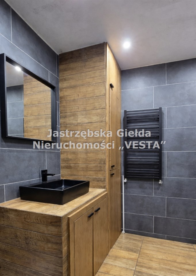 Łazienka parter - nowoczesna i spójna, połączenie drewna i grafitowych płytek wygląda bardzo elegancko, zabudowa do sufitu daje dużo miejsca do przechowywania, na wyposażeniu kabina z prysznicem, nowe sanitariaty.