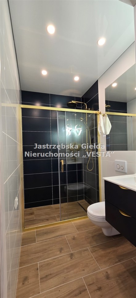 Łazienka na wyposażeniu kabina z prysznicem, ściany w glazurze, nowe sanitariaty.